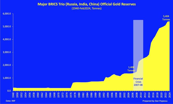 But why are gold prices rising? Because BRICS is stacking gold bricks, and the Russian sanctions eroded the store-of-value function of the dollar.