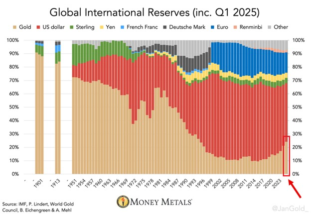 Gold's share of global international reserves rose 3 percentage points in Q1 2025, to 24%, the highest in 30 years.