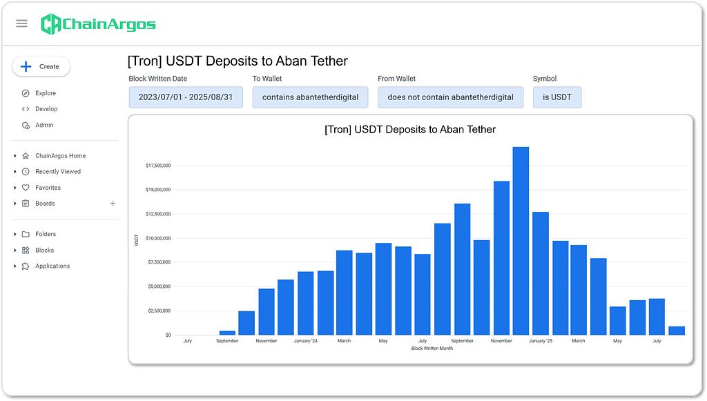 Here are USDT deposits to Aban Tether, by month, on TRON: