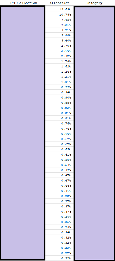 I’ve written about my portfolio review process before, and even gone through every individual token in it. But that was only for fungible tokens. Today I went through and with the help of chatGPT was able to pretty quickly create a spreadsheet of (almost) all my NFTs and their current value, which I then used to create some insightful data points.