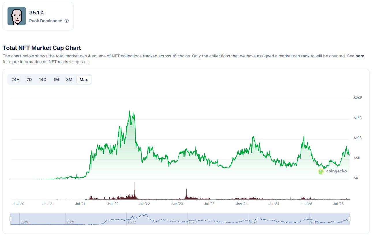 The NFT market moves in a couple of different ways. It’s important to note just how small the market is. The total marketcap of ALL NFTs is just over $6 billion, and 35% of that is made up by CryptoPunks.