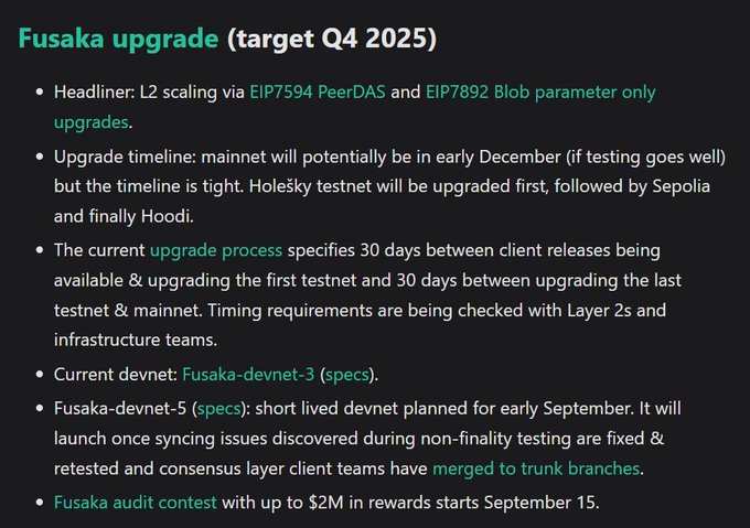 🦓 Fusaka upgrade 🔝 Headliner: L2 scaling via PeerDAS + Blob parameter only upgrades 📅 Mainnet potentially in December 🧪 Current devnet: Fusaka-devnet-3 🕵️ Fusaka audit contest starts Sept 15 (1/3)
