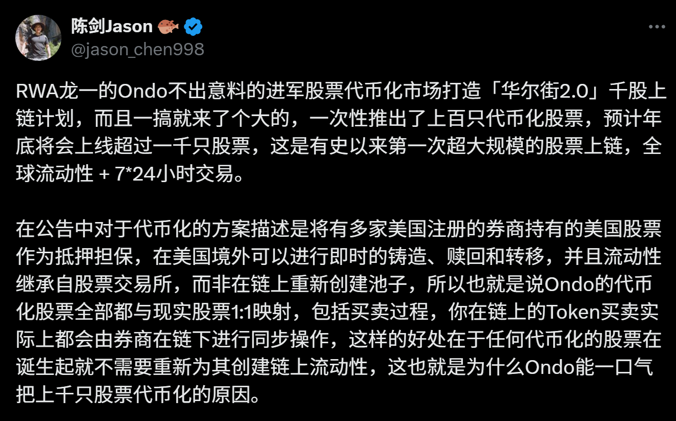 The latest radical exploration comes from Ondo Finance, which adopts a more direct "on-chain instructions, off-chain real stock synchronous trading" model. The purchases and sales completed by investors on the chain will be executed in real time off-chain by the cooperating brokerage. This means that tokenized stocks do not need to rely on additional on-chain liquidity pools and naturally have the potential for large-scale expansion.