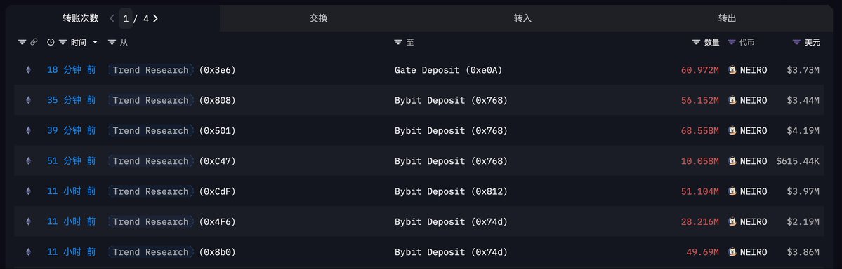 Trend Research has transferred one-third of its total $NEIROETH to exchanges today. In addition to continuing to transfer NEIROETH to Bybit, they have also begun transferring NEIROETH to Gate. They have transferred nearly half of their holdings to exchanges today: from a total of 670 million (67% of the total), they have transferred 324.7 million $NEIROETH ($22 million) to exchanges today.