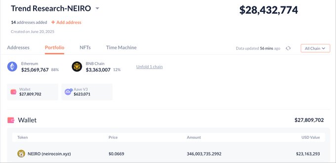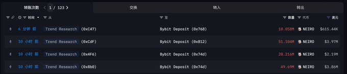 Trend Research 今天已经累计转进 Bybit 1.39 亿枚 $NEIROETH ($1064 万)。