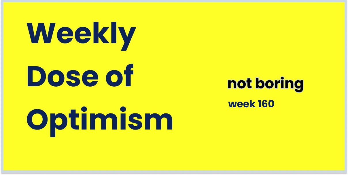 Happy Friday and welcome back to our 160th Weekly Dose of Optimism. Packy here, filling in for Dan who is trapped under a mountain of creatine gummy orders. Your humble Dose writer vaguely told Bloomberg this week that the company is going do somewhere between $40-80 million in revenue this year, so if you notice a lot more fit, healthy people walking around than usual, you know why.