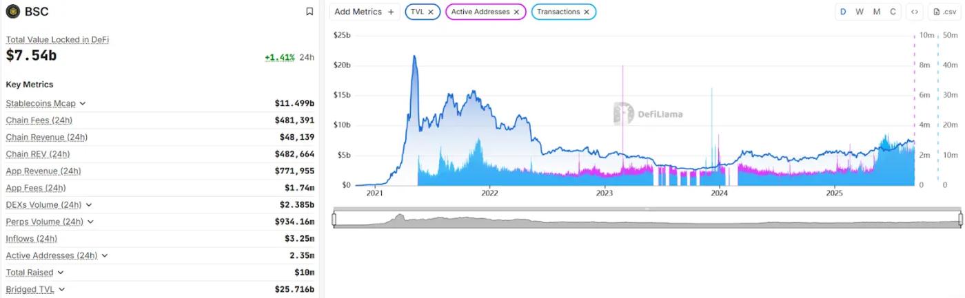 After Binance launched its built-in Web3 wallet and upgraded its Alpha platform in early 2025, BNB Chain saw significant growth in on-chain users. This helped Binance attract a significant number of CEX users to the blockchain with a low barrier to entry: users could simply open a Binance Web3 wallet within the Binance app and directly access BNB Chain's DApps and DeFi services. This seamless integration lowered the barrier to entry for Web2 users, significantly expanding BNB Chain's user base. During Q1 2025, Binance Web3 Wallet added over 2 million new users, approximately 40% of whom first encountered and used BNB Chain through Binance Alpha's token launch event (TGE). As a result, BNB Chain's daily active addresses continued to reach new highs throughout 2025: average daily active addresses climbed from approximately 1.2 million at the beginning of the year to 1.6 million in Q2, daily transactions surged from 6 million to over 15 million, and daily active addresses approached 2 million. The centralized exchange -> on-chain traffic diversion effect is very significant: one-click wallet access has converted millions of original Binance users into BNB Chain on-chain participants, driving a leap in the scale and activity of on-chain users.