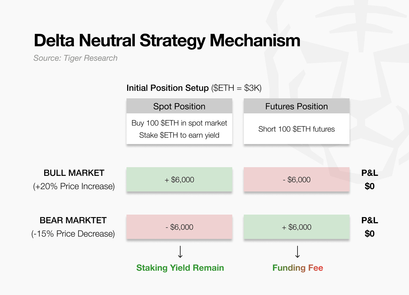 Ethena demonstrates this by holding spot ETH while simultaneously shorting an equivalent amount in futures. Gains on one side offset losses on the other, keeping portfolio value stable regardless of price direction (see Figure).