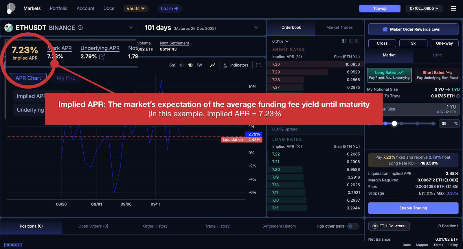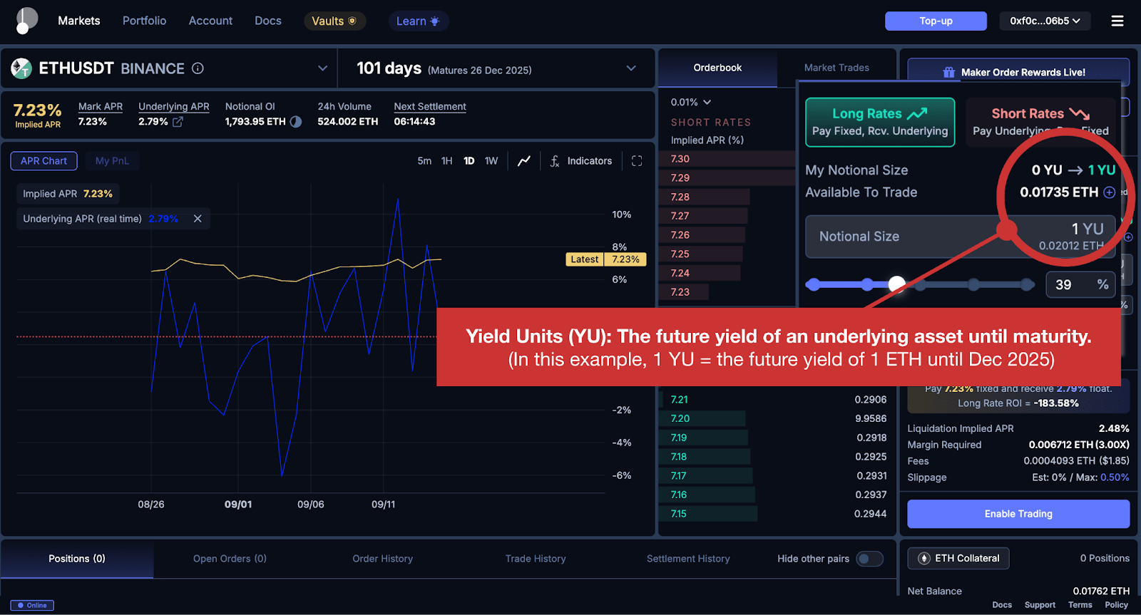 A key concept in YU trading is the implied APR. This represents the market's expectation of the average funding rate yield until maturity and is currently reflected in the YU price.