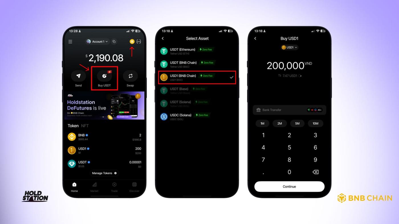 How to deposit USD1 on BNB Chain? Deposit gas-free via BNB Chain or buy directly with VND in Holdstation wallet.