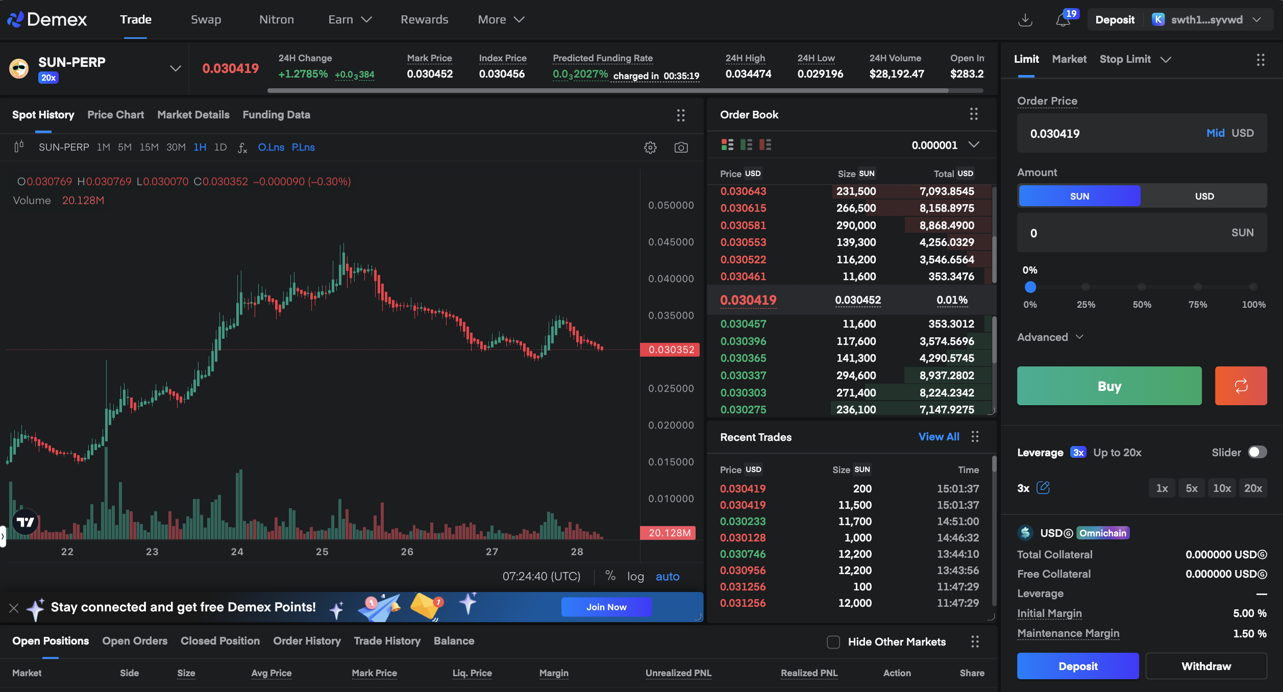 Easy Access to Perpetual Futures: SunPerp is a decentralized exchange (DEX) launched on the TRON network. It offers perpetual futures contracts, meaning you can take long or short positions without expiry.Low Fees & High Liquidity: Designed to minimize cost and slippage, you benefit from competitive fees and deep liquidity across over 100 markets.User-Friendly Interface & Security: You can connect your TRON-compatible wallet, deposit USD-pegged stablecoins (like USDT), set your leverage, and manage risk. Always make sure to use best practices (secure wallet, small test trades) when starting.