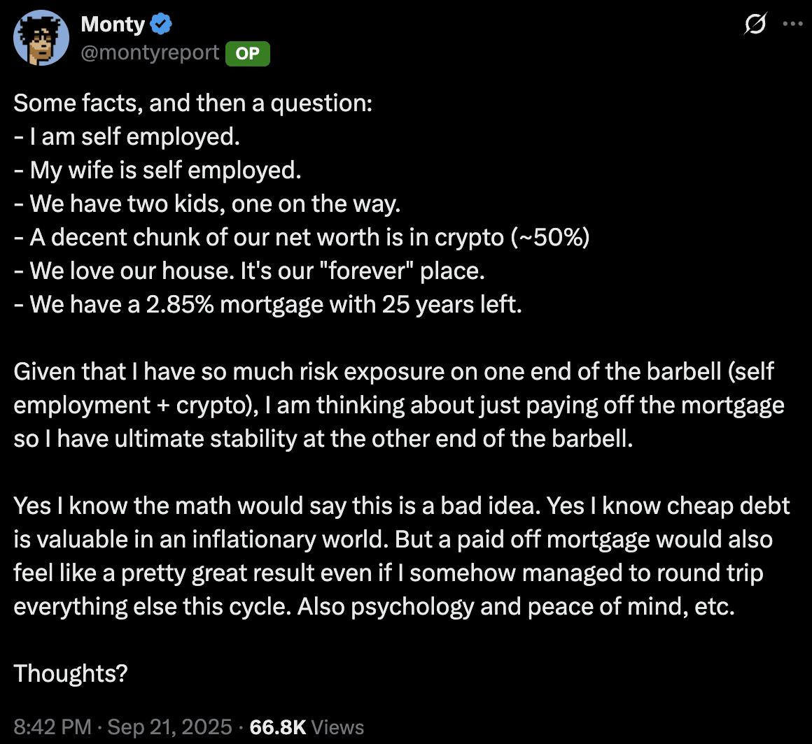 You can’t put a price on the security of having your primary place or residence paid off and in your own hands, especially if you are otherwise working and earning in a risky industry like crypto.