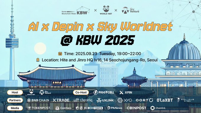 🔥 AI x DePIN x Sky Worldnet @ KBW 2025 📅 Sept 23, 19:00-22:00 | 📍 Seoul Join us for an exciting night exploring the future of #AI × #DePIN! 🚀 🎁 To celebrate, we’re giving away 20 XPIN 10GB e-SIM cards (valid in 149 countries)!⬇️ 1⃣Follow @WorldNet_web3 & @XPINNetwork
