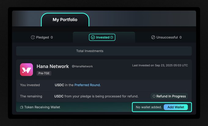 Reminder - for those who received $HANA allocation from the @HanaNetwork Public Sale: To ensure a smooth claim process on TGE day, add your EVM wallet to claim from, on our Capital Launchpad. Simply head over to the "Invested" tab in "My Portfolio", where you'll see an option to choose. If you don’t add by TGE date, you'll be able to add after, and then then claim after TGE if needed!