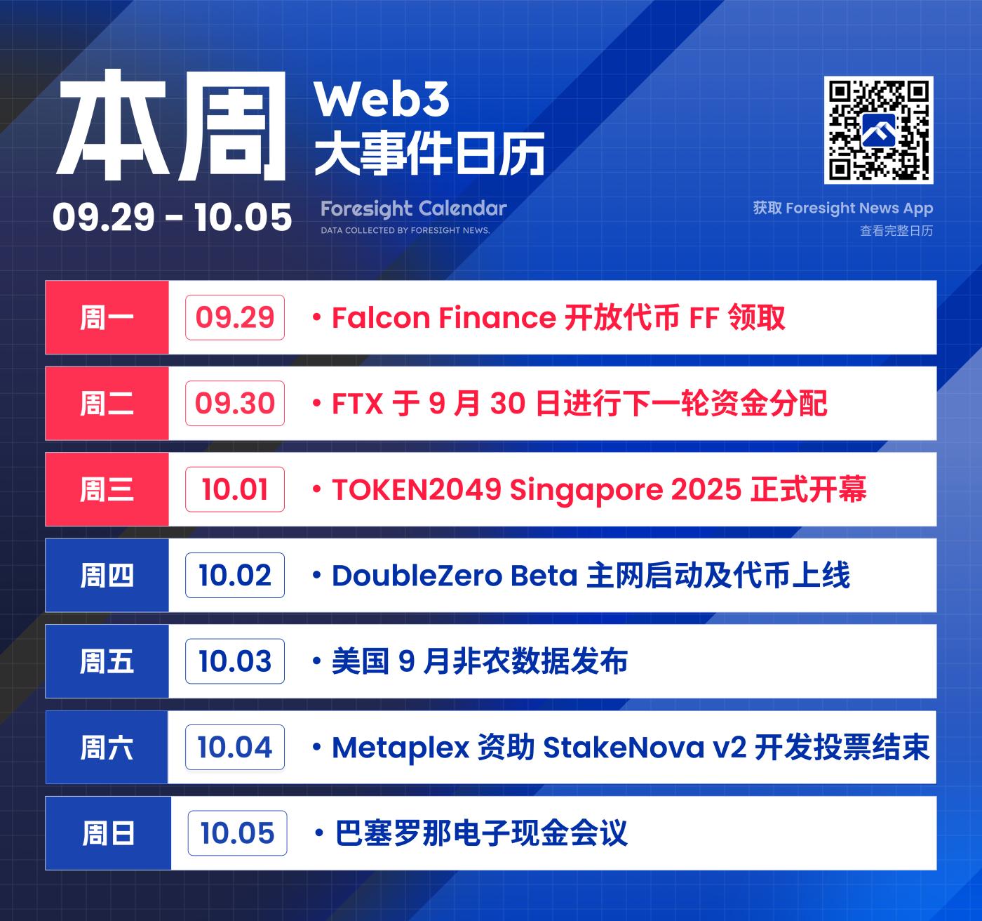 Wednesday (October 1): TOKEN2049 Singapore 2025 will be held in Singapore from October 1 to 2, 2025. Foresight News has compiled nearly 600 related events, click here to view .