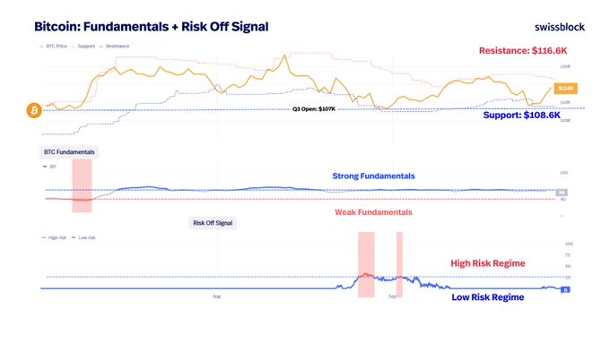 One day before month-end, BTC is pushing for a record monthly close above $115.8K. Not bad for a month that began uncertain and leaning bearish. Key indicators hold steady: 🔸Fundamentals stayed in strength most of Q3 (except early July). 🔸Risk-Off Signal only destabilized mid-August, but never entered high-risk regime, allowing BTC to build a bottom below $110K. Remember: there is no bullish-to-bearish trend shift without a high-risk regime + weakening fundamentals. For now, despite stress, Bitcoin still carries the strength for a push higher into Q4.