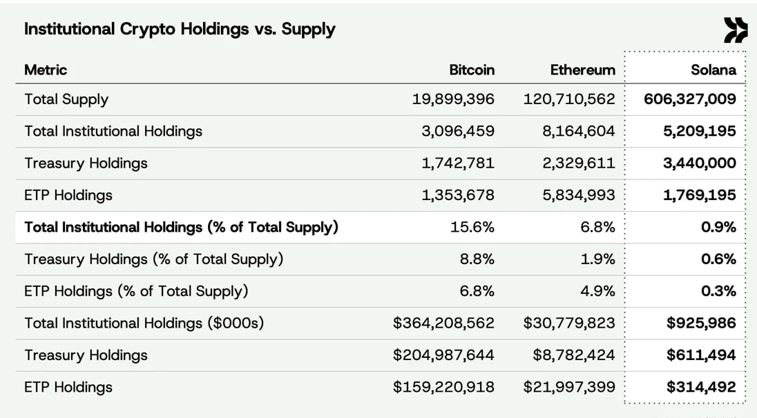 Institutional allocation data tells a compelling story - asymmetric opportunity. Solana sits at a mere 0.9% institutional penetration of total supply, dramatically trailing Bitcoin’s commanding 15.6% and Ethereum’s established 6.8%. This disparity becomes even sharper when examining corporate treasury allocations, where Solana captures just 0.6% versus Bitcoin’s massive 8.8% and Ethereum’s 1.9%. The absolute numbers are staggering: Solana’s $926 million in total institutional holdings represents a rounding error compared to Bitcoin’s $364 billion war chest and Ethereum’s $31 billion allocation. What we’re witnessing is a classic catch-up trade in the making - institutional capital recognizing Solana’s technical superiority and ecosystem momentum while the allocation gap remains wide open. As institutions begin connecting the dots between performance metrics and portfolio allocation, this underweight positioning creates one of crypto’s most compelling asymmetric bets.