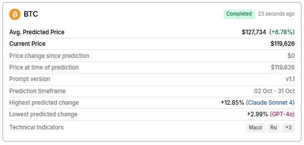 Given the month’s reputation as one of the strongest trading months, and since the asset is already climbing toward the $120,000 psychological threshold, Finbold consulted its AI Signals machine learning tool that integrates large language models (LLMs) with momentum-driven market technical indicators.