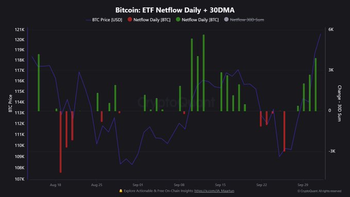 Spot Bitcoin ETFs just did $1.08B in volume over the last 4 days. They are pushing price together.