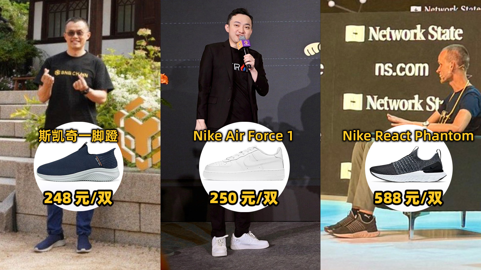 According to @CryptoDoggyCN, CZ wears Skechers slip-ons for about 248 yuan a pair. CZ himself responded by calling the shoes "efficient, simple, comfortable, and affordable," adding that he bought them on Amazon and doesn't understand clothing. Justin Sun favors Nike Air Force 1s, a common trait among men born in the 1980s and 1990s, which cost about 250 yuan. Vitalik wears Nike React Phantom running shoes, which cost about 588 yuan.