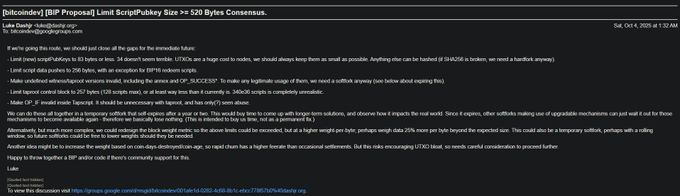 A soft fork proposal shared by @LukeDashjr in the Limit 'ScriptPubkey Size >= 520 Bytes' thread on mailing list.