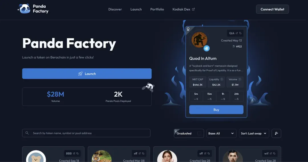 Panda Factory is a codeless token deployment tool launched by Kodiak, specifically designed for issuing memecoins and other highly volatile assets. It uses a custom bonding curve to determine the initial price and ensures that initial liquidity cannot be withdrawn, thus avoiding the security risks of traditional launch models. Once launched, new tokens immediately gain trading depth on the Kodiak DEX and receive PoL rewards, significantly improving the cold start efficiency of new assets.