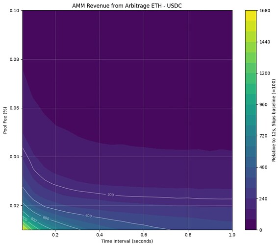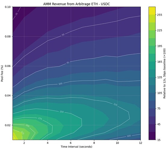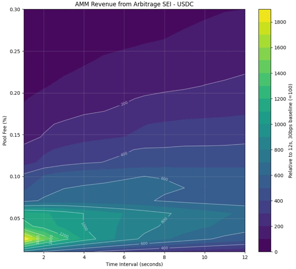 Figures 4 and 5 visualize simulated revenue from arbitrage transactions for different fees and block times for ETH and SEI pools, respectively. In both cases, the arbitrage revenue pools increase as fees and block time decrease. However, if the pool fee is decreased too close to 0, the revenue starts decreasing. Revenue increases when fees and block times decrease because the additional revenue from additional arbitrage opportunities more than compensates for the lower fee income per transaction. These results are in line with Milionis et al.