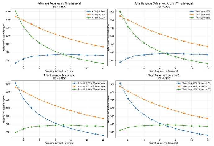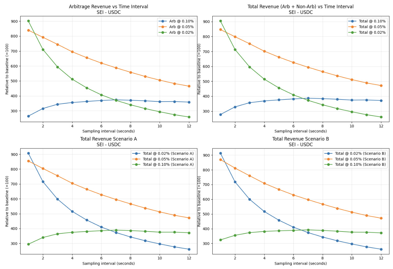 Figure 8 shows contradicting results with SEI. Revenue from arbitrage is the highest for visualized fees with 12-second blocks when the fee is 5 bps, but as the block time decreases, the 2 bps fee generates the most arbitrage revenue. If an optimal block time and fee combination were to be used, the AMM pool’s revenue from arbitrage could increase to 15 times the current revenue. The results do not change significantly for the second subplot with both toxic and noise trading volume, which is due to volume arising out of arbitrage playing such a significant part in the total revenue of the pool. The same holds even in Scenarios A and B due to the noise trading volume being so small relative to the amount of revenue that is to be made from optimizing for arbitrage. Other tokens with limited liquidity, such as some memecoins, had similar characteristics.
