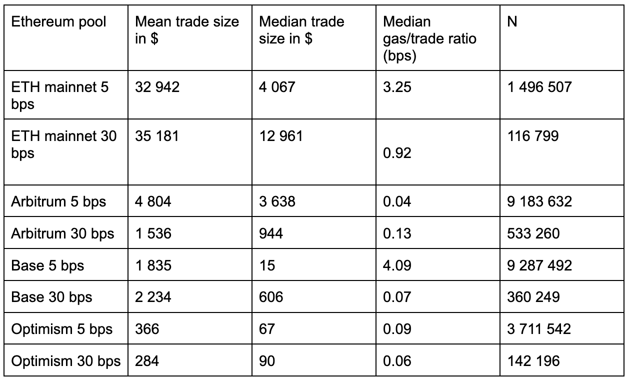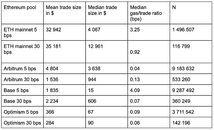 Table 6 displays mean and median trade sizes as well as median gas-to-trade ratio for 5 bps and 30 bps Ethereum pools on top of different chains. The amount of gas used relative to the amount traded is above 1 basis point only for mainnet 5 bps and base 5 bps pools. This means that, excluding these pools, the amount of money traders spend on gas, on average, is relatively nonexistent. However, it is important to note that the mean and median trade sizes in mainnet are multiple times higher than other chains. This means that the gas fee would play a significantly bigger role if trades on mainnet were smaller.