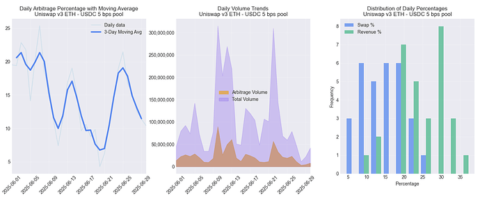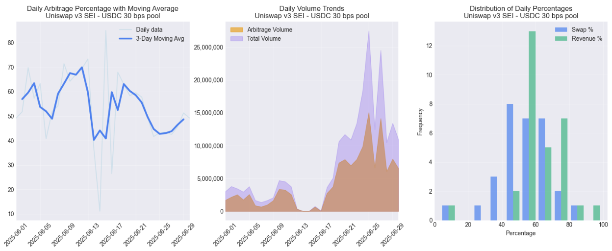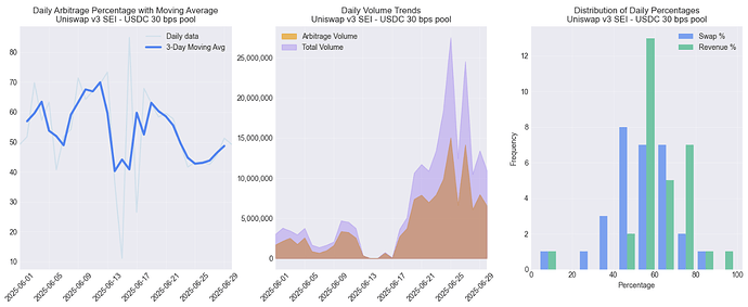 Table 1 lists the percentage of arbitrage transactions and their volume in different pools, and Figures 2 and 3 visualize them for the ETH-USDC 5 bps and SEI-USDC 30 bps pools, respectively. Out of the studied pools, all except SEI have a higher arbitrage percentage in terms of volume than in terms of transaction count. This indicates that arbitrage transactions tend to be bigger than the average transaction in size. This is also supported by visualizations in Figures 2 and 3. The third subplots in Figures 2 and 3 visualize distributions for arbitrage count and revenue and indicate that this is also the case on a daily level. Other pools that are not visualized had similar distributions.