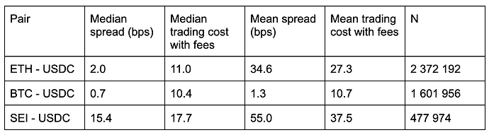 Table 5 lists bid-ask spreads and trading costs with fees for different pairs. The median spread ranges from 0.7 bps to 15.4 bps, with ETH and BTC having low median spreads, while SEI has a 15 times higher spread than ETH and BTC. Interestingly, when looking at mean spreads, BTC’s spread is only half a basis point higher than the median, while ETH is 17 bps higher at 35 bps, and SEI is over three times higher at 55 bps. In terms of trading costs with fees, the medians are 10 and 11 bps for BTC and ETH, while the cost is 18 bps for SEI, and the fees vary between 10 and 38 bps when considering the mean costs.