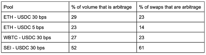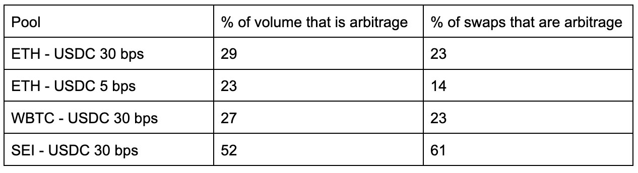 Table 1: Percentage of arbitrage transactions and their volume in different pools