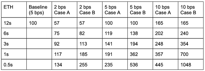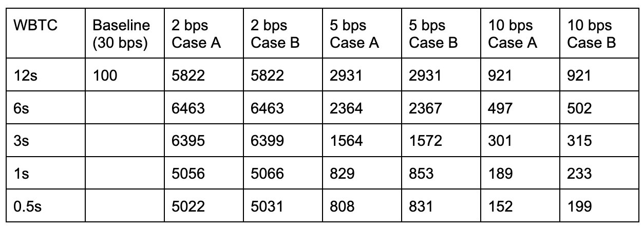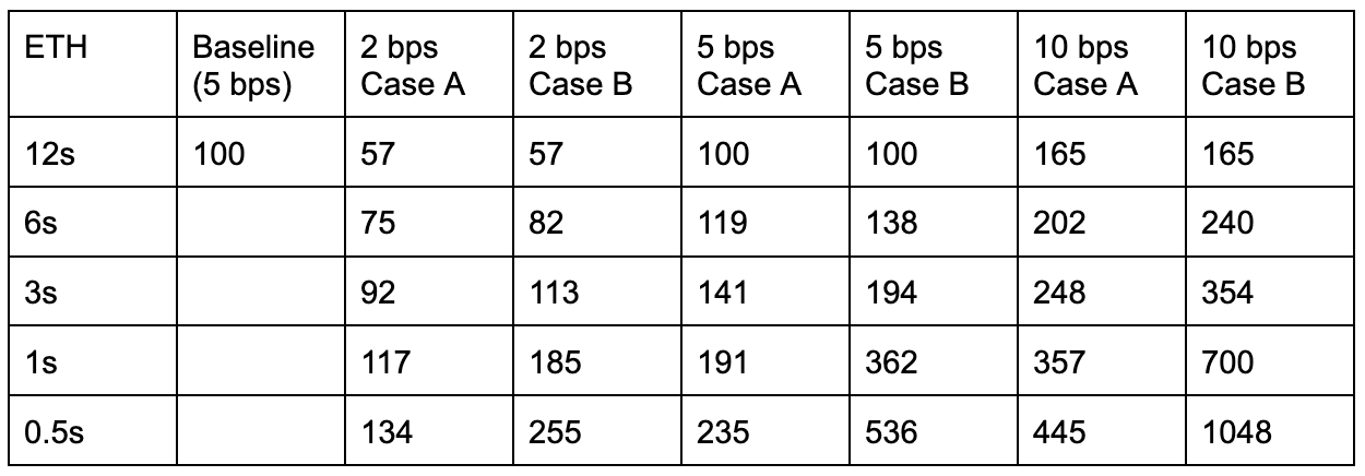 Third, the block time results in trades being settled every 12 seconds, which results in traders being uncertain at which price their trade will be settled. For example, if a trader sends a transaction 2 seconds into a slot, they are exposed to the price evolution of the asset for 10 seconds before the trade is settled. For example, if a token is trading at $10,000 and a trader initializes a transaction to buy 1 token for $10,000 with tight slippage tolerance, and the centralized exchange price increases to $10,050 before the next block, the trade fails, and the trader misses out on the $50 of profit. However, had the block time been shorter, the trade would have gone through.