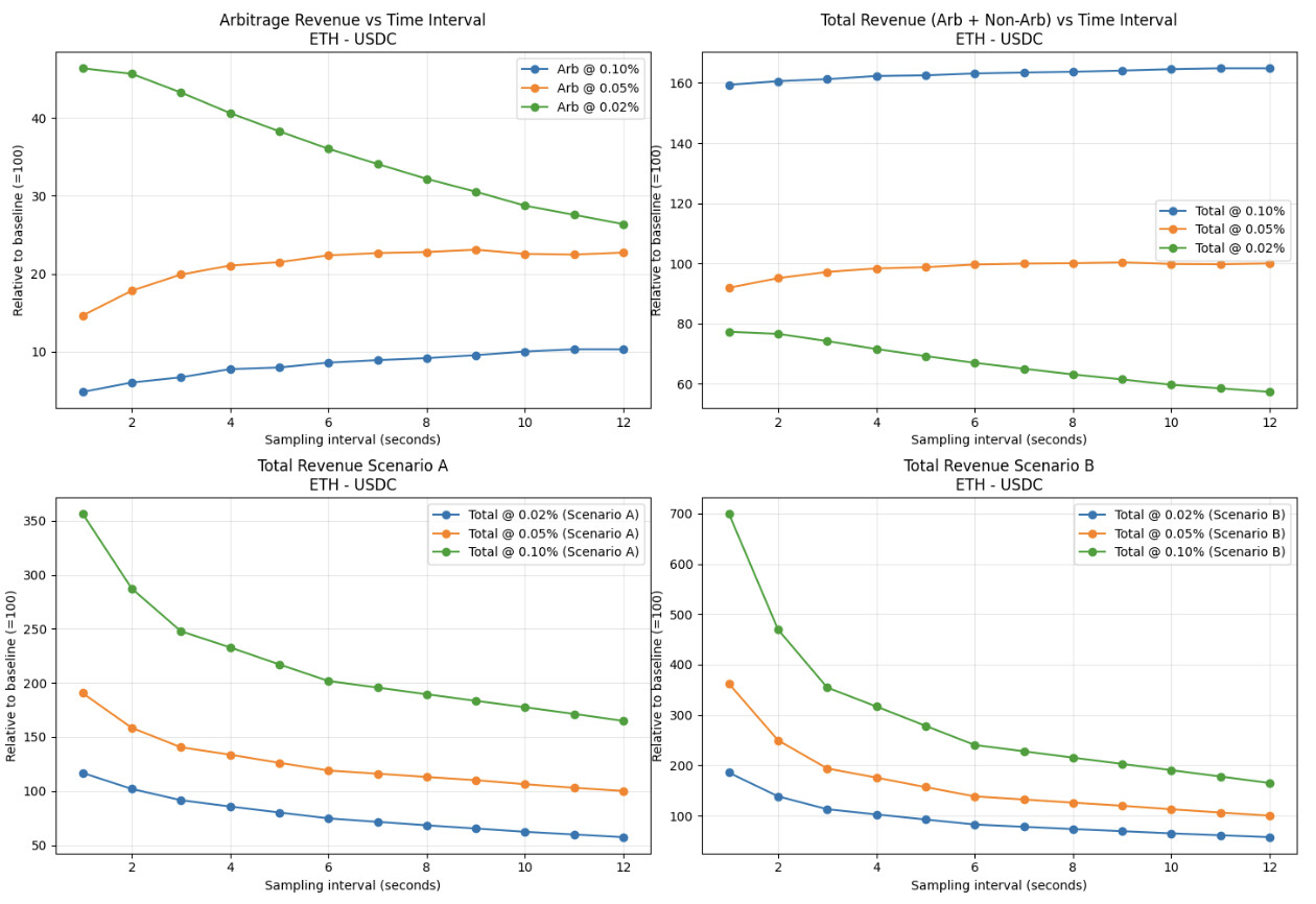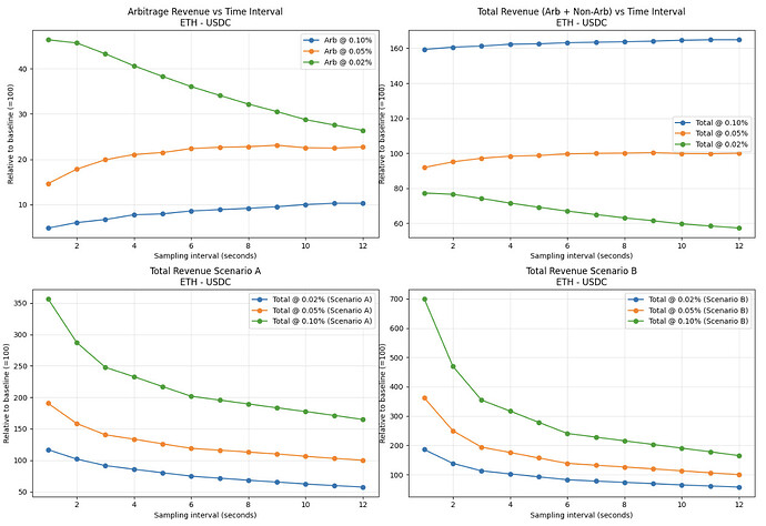 After determining the baseline for toxic and noise trading, I simulate how the amount of arbitrage would change if block times were decreased or fees were changed. This is done by analyzing price movements from the Binance 1-second candle and trade data, and sampling the data into different periods. For candle data, open prices are used to determine the price movements during a period of time. For trade data, the price of a trade with a matching timestamp or the last timestamp before the end of a period is used to calculate the price movements. Based on this, I analyze how different block times and fees affect the amount of arbitrage and AMM’s revenue from it.