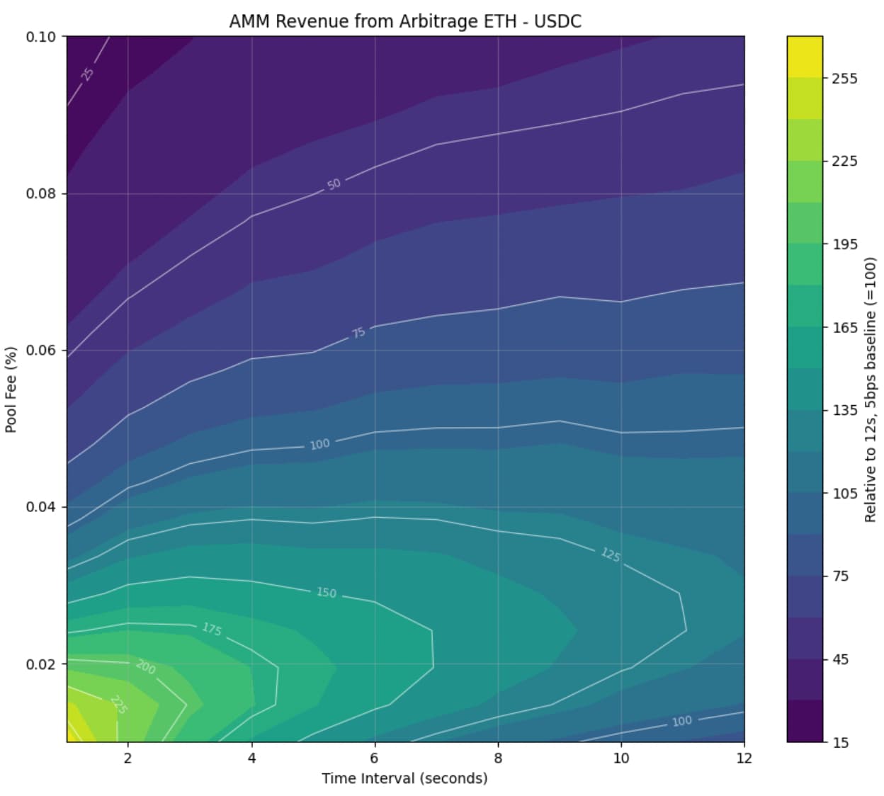The findings demonstrate that shorter block times would benefit the AMMs by reducing the need for arbitrage protection, thereby allowing pools to offer lower fees while maintaining liquidity provider protection. This creates a cycle: lower fees attract more trading volume, improve price competitiveness with centralized exchanges, reduce transaction failure rates, and decrease price staleness. AMM pools fall into two categories: ones with high toxic volume that should optimize fees for arbitrage protection and others that should focus on maximizing overall volume through competitive pricing. For the studied highly toxic volume pool, the revenue for short block times combined with optimal fees could increase the revenue by up to 15 times while the increase in revenue could be about 60% without increase in noise trading volume for ETH - USDC, and up to 600% if the noise trading volume was to increase significantly as the result of lower block time.