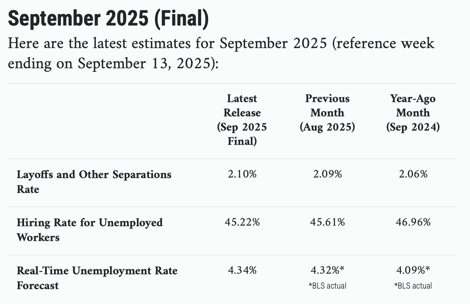 Employment growth is an unreliable signal and slack is the story now: Goolsbee underscored that traditional measures like monthly payrolls have become noisy and potentially misleading, especially when immigration, labor-force participation, and survey response rates are volatile. His team’s new Chicago Fed Labor Market Indicators are meant to fill this data vacuum by tracking flows in and out of employment. This directly echoes Guy Berger’s argument in “We Don’t Need More Employment Growth Nowcasts!”: the economy no longer needs more guesses about payrolls; it needs slack nowcasts - these real-time measures of hiring rates, separations, and the true level of labor-market tightness. Goolsbee’s “bathtub” metaphor (inflows and outflows) is exactly that kind of slack measurement.
