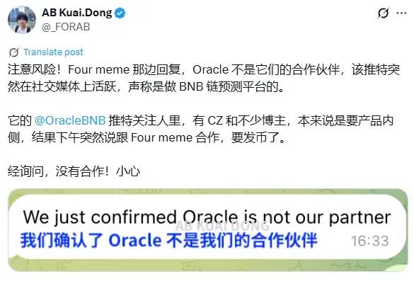 According to ChainCatcher, crypto KOL AB Kuai.Dong posted on social media that Four.meme officials claimed that the so-called "BNB Chain prediction market project Oracle" is not a partner of Four.meme.