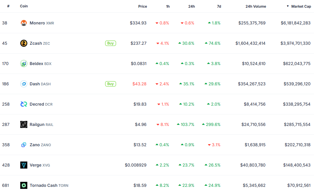 According to Coingecko data, the privacy coin market saw a general rise today (10th), with Zcash, Dash, Railgun, Verge, Tornado Cash, and other top-ranked coins experiencing substantial increases.