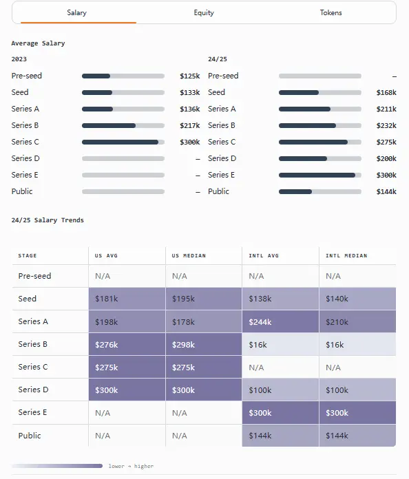 Salaries and token awards declined across nearly all levels. US-based roles still lead in cash compensation, while international teams are closing the gap by offering larger equity and token awards. Equity distribution is uneven, particularly for non-technical, non-executive roles. US-based compensation has narrowed, while international roles can sometimes reach 2 to 10 times US levels.