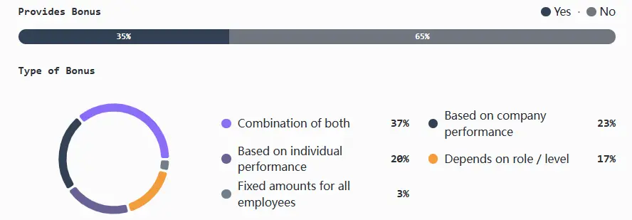 Where bonuses exist, they are typically linked to both company and individual performance (a mix). Links to company only, individual only, and position/level-based models are less common, and fixed bonuses are also rare.