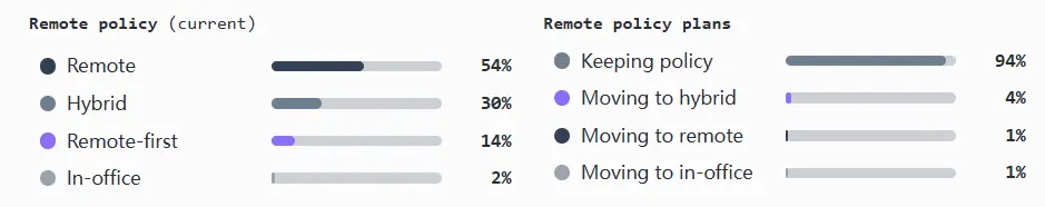 More than half of companies are fully remote, more than a quarter are using a hybrid model, and a smaller proportion, 14%, are remote-first.