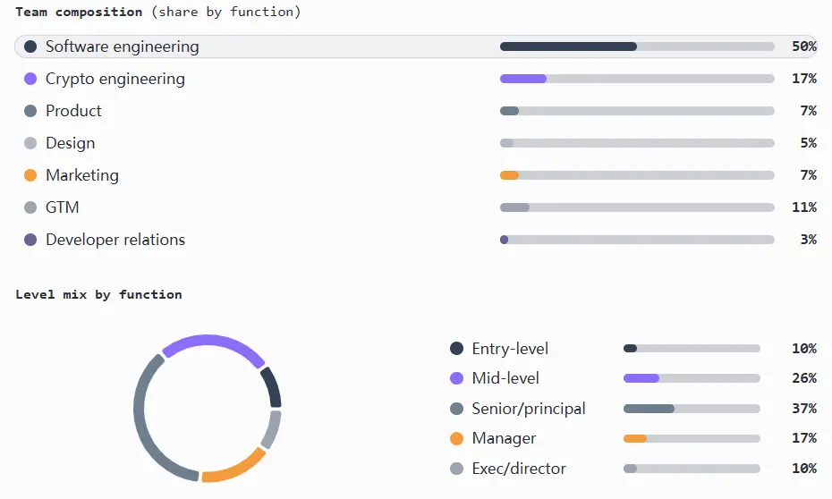 The crypto industry has long been dominated by engineers, a trend seen across all sizes, stages, and funding levels, from pre-seed to post-Series B. International teams tend to be more heavily engineered, while product and marketing leadership positions are heavily concentrated in the US.