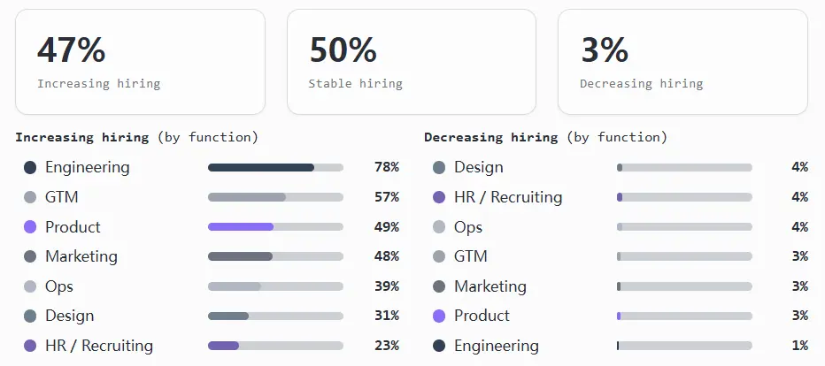Engineering led the growth, with approximately 78% of teams expanding and only 1% reducing staff. It was also the only department with a true pipeline of junior-level hires.
