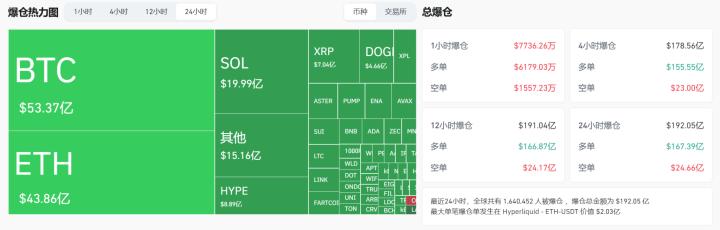 Mars Finance reported on October 10th that according to Coinglass data, the total liquidation across the entire network rose to $448 million in the previous hour, of which $423 million was caused by long positions. Over the past 24 hours, the total liquidation across the network rose to $780 million, of which $623 million was caused by long positions and $157 million was caused by short positions. In the past 24 hours, a total of 200,088 people worldwide were liquidated, with the largest single liquidation occurring on Hyperliquid's BTC-USD exchange, valued at $11.6058 million.