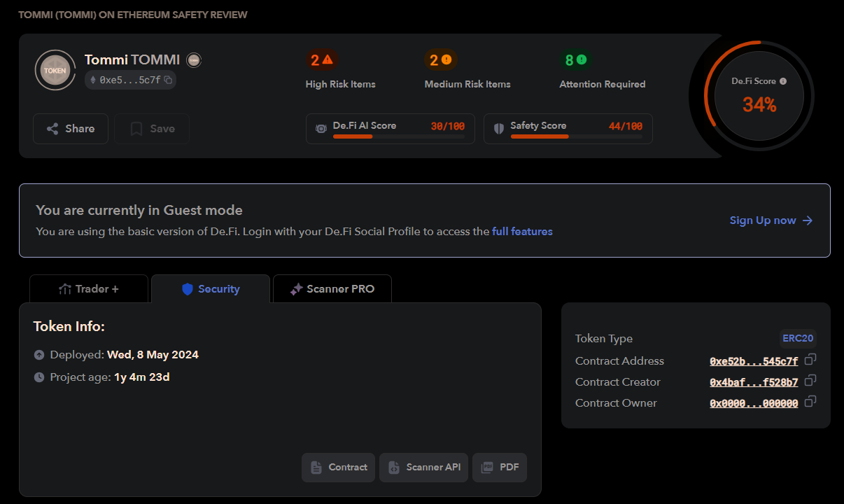 The second step is to perform a contract health check: You can first use a one-click health check tool such as De.Fi Scanner to quickly screen for landmines - they are not audits, but they are enough to raise red flags for obvious pitfalls in advance (as shown below).