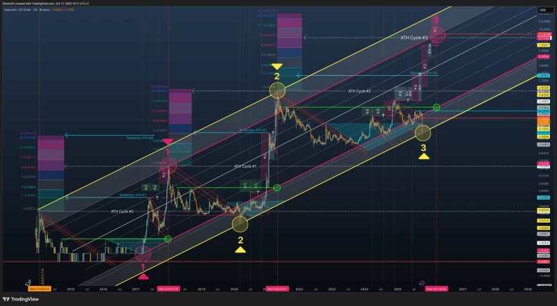 The weekly chart highlights Dogecoin trading at $0.19 and $0.20 in a consistent manner with the previous cycle bottoms. Resistance is now near $0.34-$0.35 with potential upside targets towards $0.90, should the bullish pattern persist. Long-term extensions of the Fibonacci series set $5-$7 for possible highs, at extreme $10+ with force on reversed cycles. Such precision in trendlines suggests the existence of an ongoing institutional awareness and algorithmic involvement in Dogecoin’s market.
