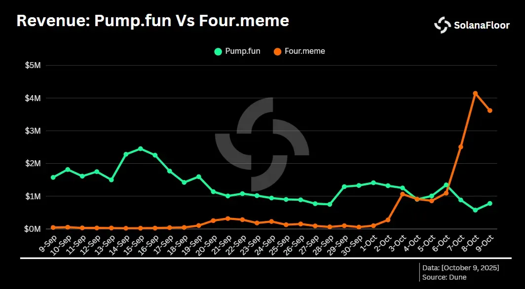 As user activity shifted, so did revenue. On October 7, Four.meme earned $2.5 million in daily fees, overtaking Pump.fun’s $900,000. The following day, Four.meme reached $4.1 million, setting a new all-time high.