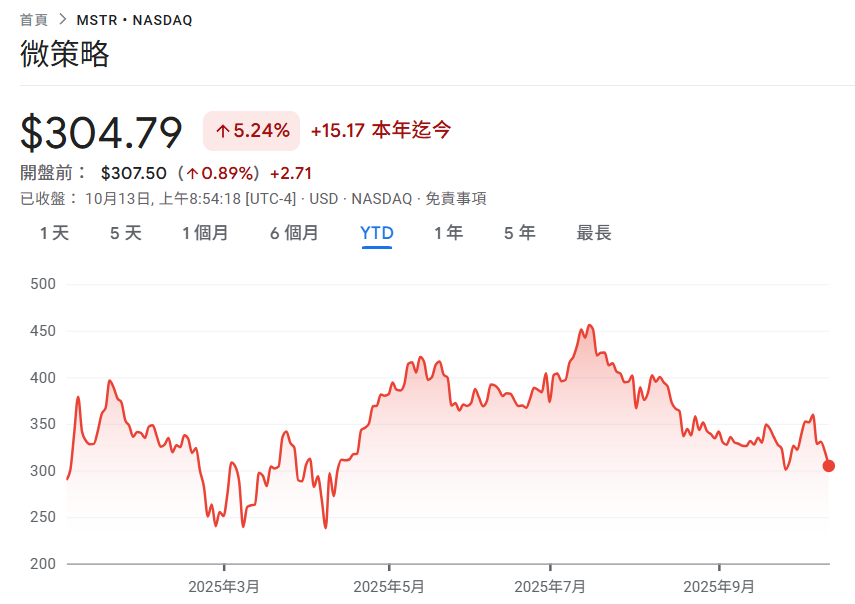 MicroStrategy's stock MSTR has fluctuated sharply in the past month. In early October, MSTR once reached $360. However, perhaps due to the large-scale liquidation in the 1011 crypto market and the decline in Bitcoin prices, MSTR's current stock price has fallen to around $300, and its market value has also slipped to $87.5 billion.