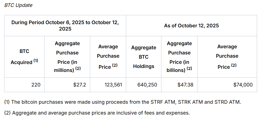 MicroStrategy, a leading Bitcoin reserve company, issued an announcement on October 13, announcing that it spent $27.2 million to purchase another 220 bitcoins between October 6 and October 12, with an average purchase price of $123,561.