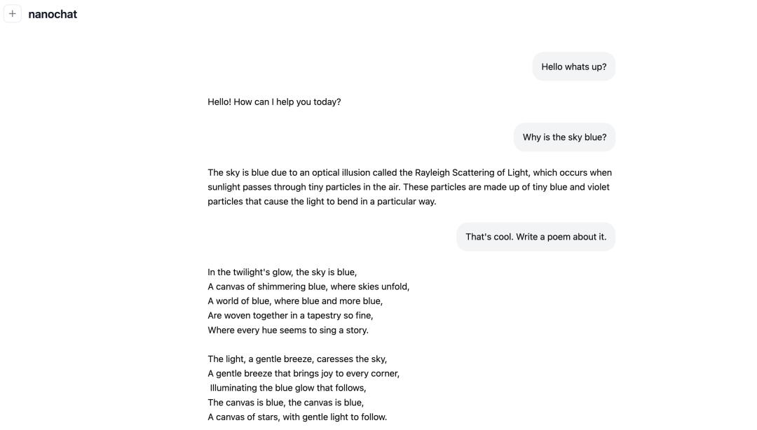 The total cost is only about $100 (training for 4 hours on 8×H100) to train and replicate a simplified ChatGPT model that can conduct basic conversations, create story poems, and answer simple questions.